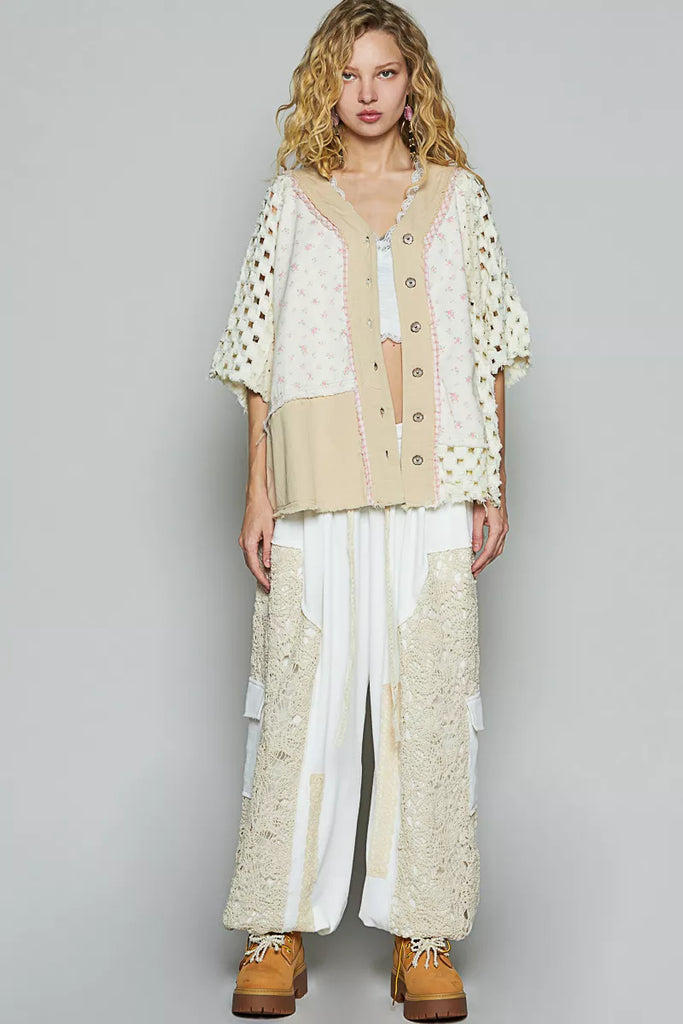 POL Button Down V-Neck Jacket with Printed Woven Patchwork