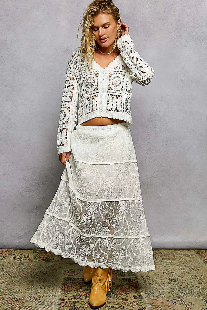 POL Button Down V-Neck Long Sleeve Cropped Crochet Cardigan
