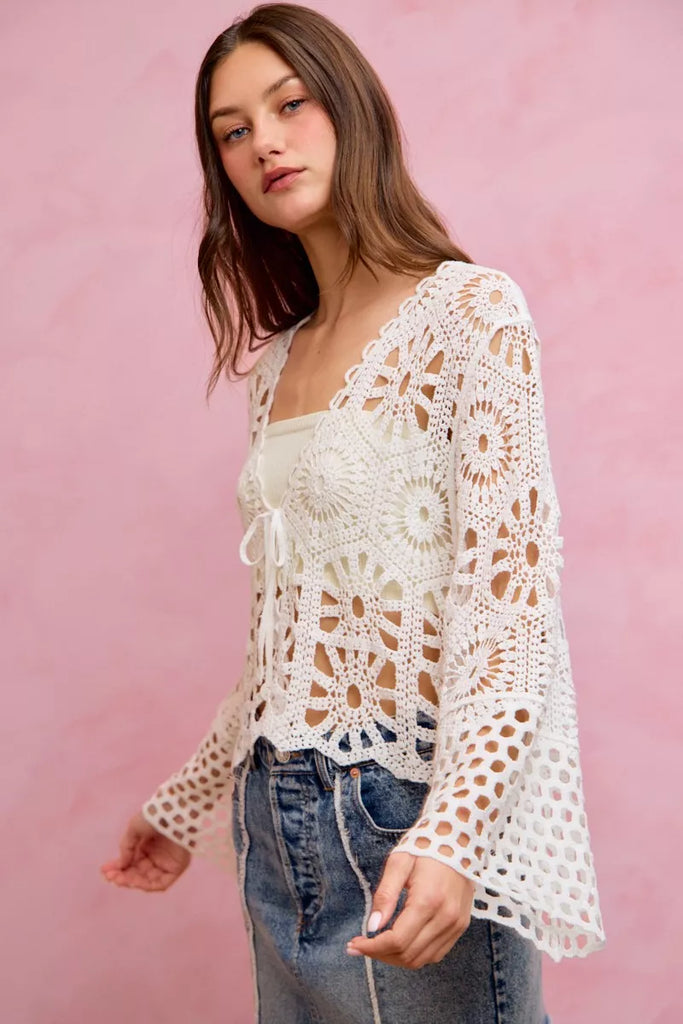 SO ME Floral Pattern Crochet Knit Tie Front Crop Cardigan