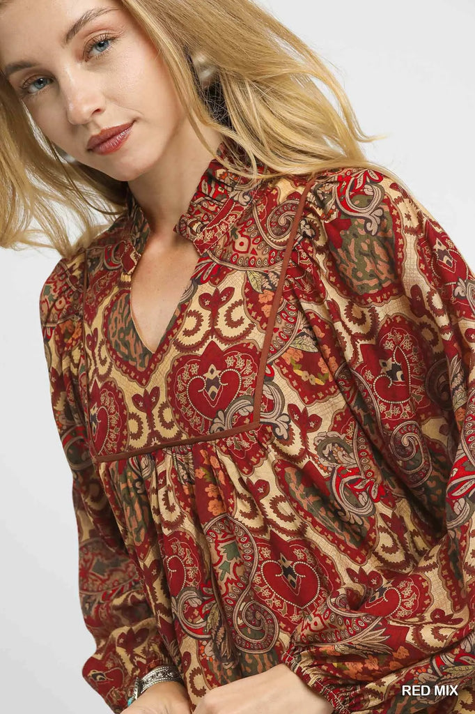 This stunning bohemian-inspired dress features an intricate paisley print in rich autumn tones of burgundy, gold, and rust. Crafted from lightweight, breathable fabric with a soft drape, this long-sleeve mini dress offers comfort and style. The flattering V-neckline and relaxed fit create an effortlessly chic silhouette, while the elastic waistband ensures a comfortable fit. Perfect for casual outings, weekend brunches, or layering for transitional seasons. The vintage-inspired paisley pattern adds a touch of retro charm to your wardrobe.