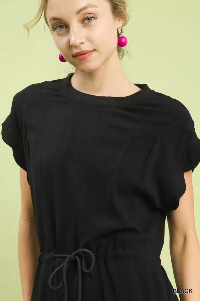 This Umgee cerulean linen blend mini dress is the perfect blend of style and comfort. The solid color and drawstring waist create a flattering silhouette. The round crew neck and short flutter sleeves with scallop detail add a feminine touch. The scalloped hemlines give the dress a unique and playful edge. Ideal for a casual yet chic look for warm weather outings.