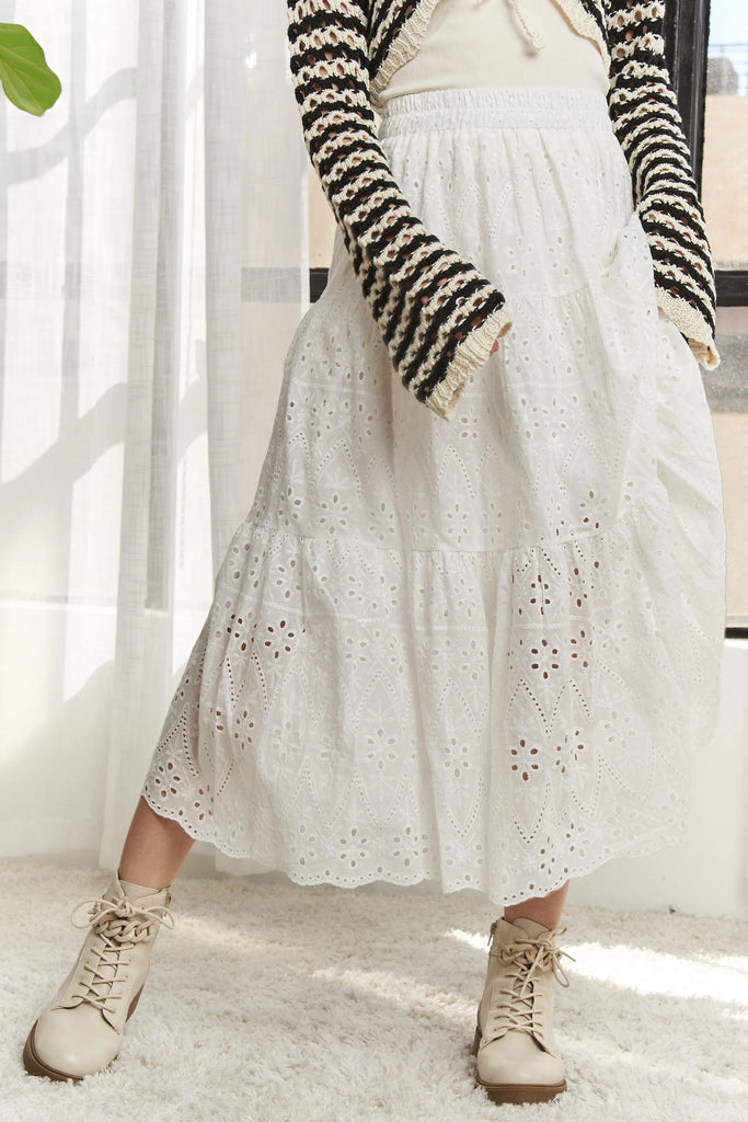 The elastic waistband tiered midi skirt is a versatile and comfortable bottom option featuring multiple tiers of fabric and an elastic waistband for a flattering fit. This skirt offers a flowy and relaxed silhouette that is perfect for various occasions. The elastic waistband provides ease of wear and all-day comfort, making it a practical and stylish choice for creating effortlessly chic and feminine outfits.