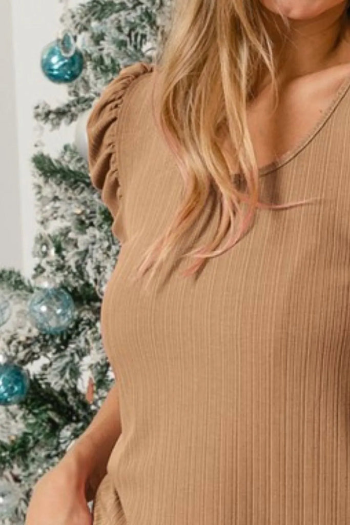 BiBi Verigated Rib Knit Puff Sleeves Shorts Top