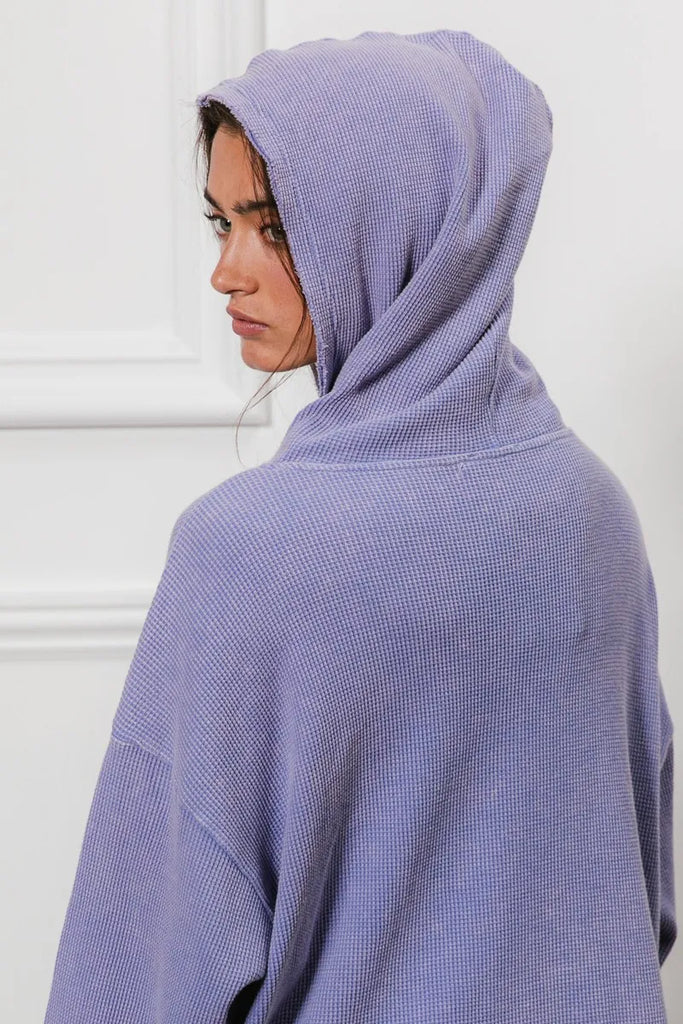 This hooded jacket is made from washed waffle thermal fabric, combining a stylish look with warmth and comfort. Perfect for casual outings or chilly days, the jacket offers a cozy and relaxed vibe. The washed finish adds a touch of texture and character to the design. Stay both cozy and trendy with this washed waffle thermal hooded jacket!