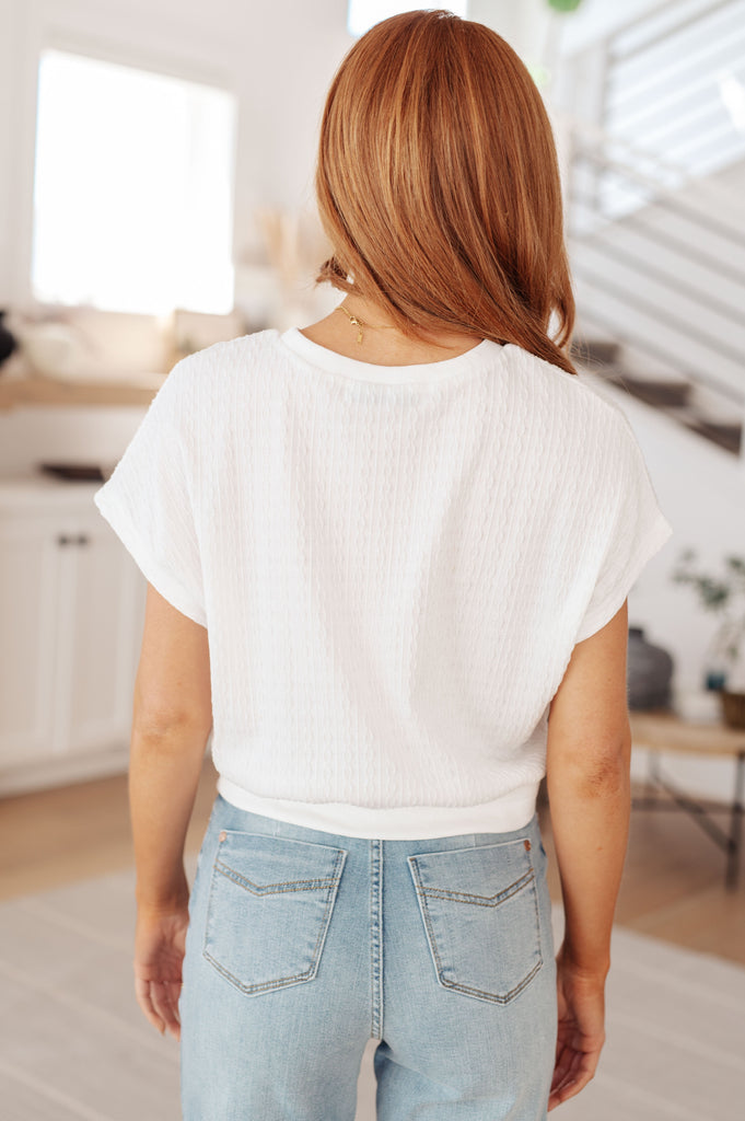 Get ready to rock a classic look with the Clearly Classic Short Sleeve Top! The cable knit fabric adds texture and interest, while the ribbed neckline and banded hem provide a modern twist. With batwing sleeves and an exaggerated ribbed hemline, you'll stand out in style.