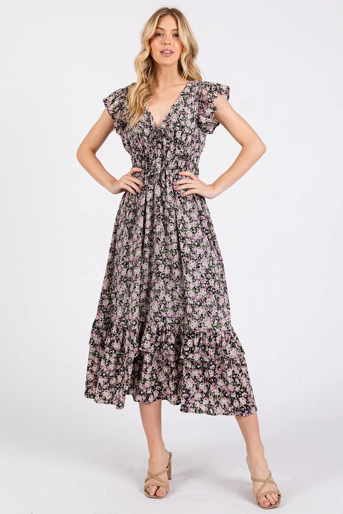 This midi dress features a charming flower print and ruffle cap sleeves for a feminine and stylish look. The V-neckline adds a touch of sophistication to the design. Made with high-quality fabric, this dress is perfect for a chic and versatile outfit. Elevate your wardrobe with this trendy flower print ruffle cap sleeve V-neck midi dress!