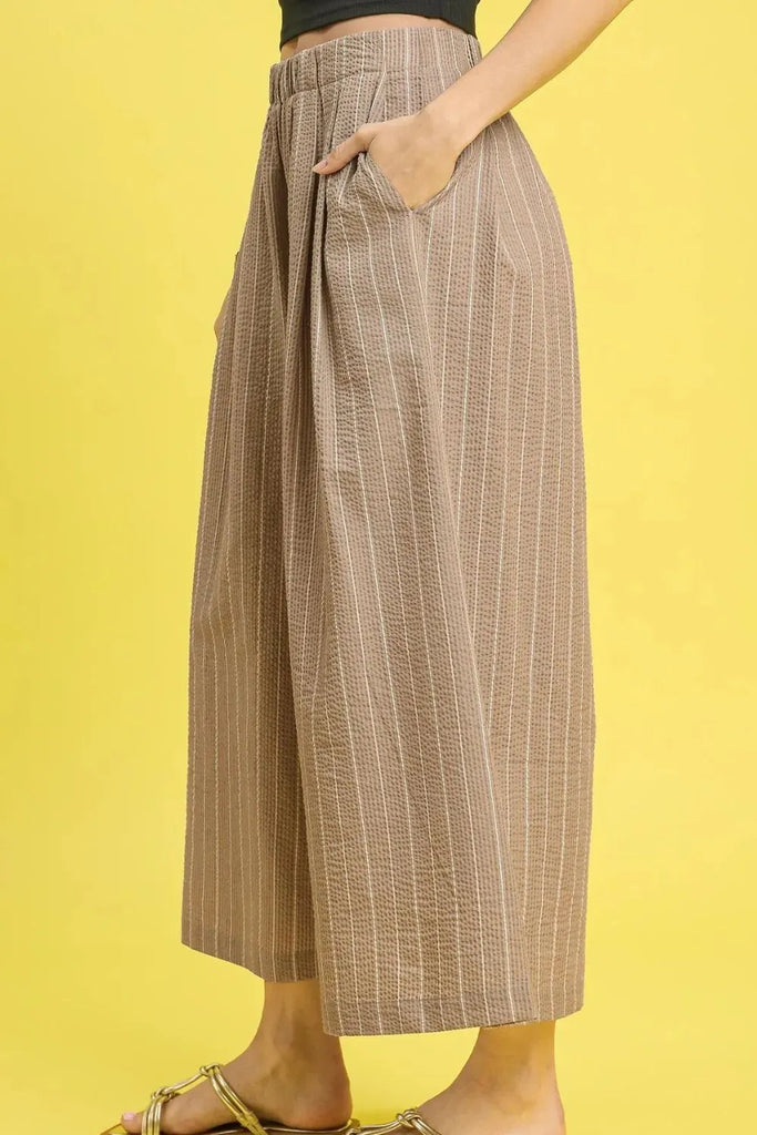 These Umgee Pinstripe Crop Palazzo Pants feature a sophisticated pinstripe pattern in a neutral taupe colorway, crafted from lightweight woven fabric for comfortable all-day wear. The wide-leg palazzo silhouette offers a relaxed, flowing fit that flatters all body types, while the elastic waistband ensures comfortable wear without sacrificing style. The cropped ankle length adds a modern touch, making these pants perfect for both casual and semi-formal occasions. Functional side pockets provide convenience, and the pull-on design makes them easy to style. The breathable fabric construction and loose fit make these pants ideal for warm weather, while the classic pinstripe pattern adds timeless elegance to any wardrobe.
