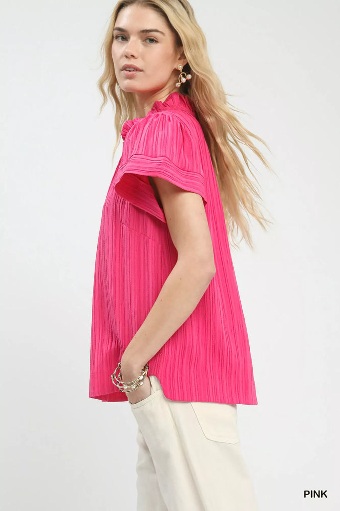 This stylish blouse features a split V-neck with a soft ruffle collar, adding a touch of femininity to the design. The flutter sleeves create a flowy and elegant look, perfect for both casual and dressy occasions. The subtle texture of the fabric adds depth and interest to the overall appearance. This blouse is versatile and can be easily paired with your favorite bottoms for a complete and chic outfit. Please note that this blouse is not lined for a lightweight and breathable feel.