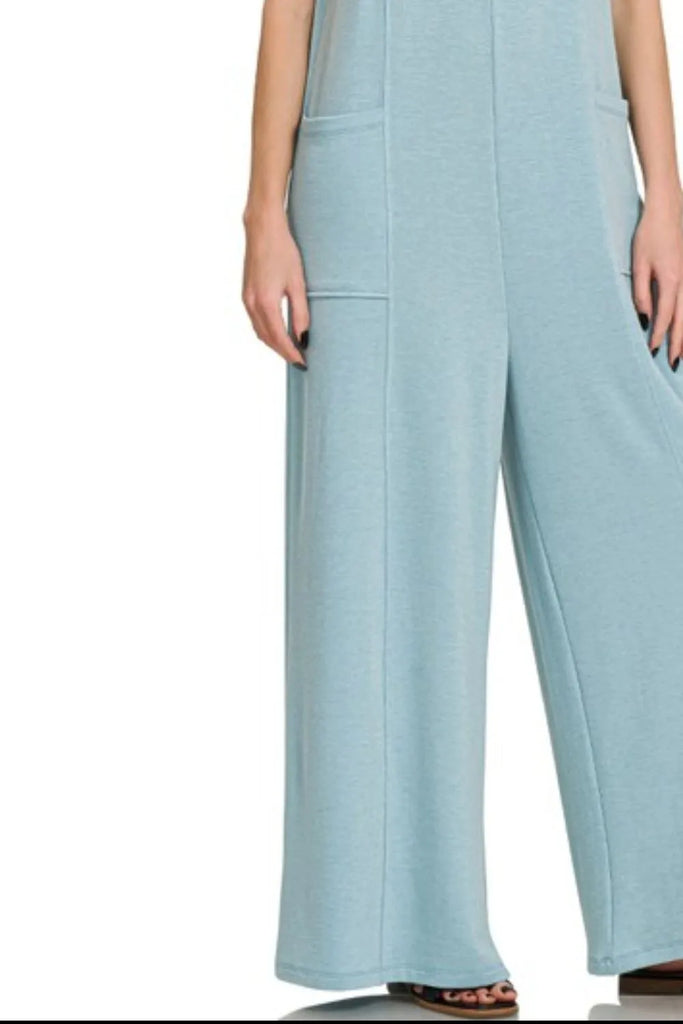 A French terry deep V neck jumpsuit is a stylish and comfortable garment made from soft and cozy fabric. It features a flattering deep V neckline and is perfect for casual or loungewear. This versatile jumpsuit can be dressed up or down for various occasions.