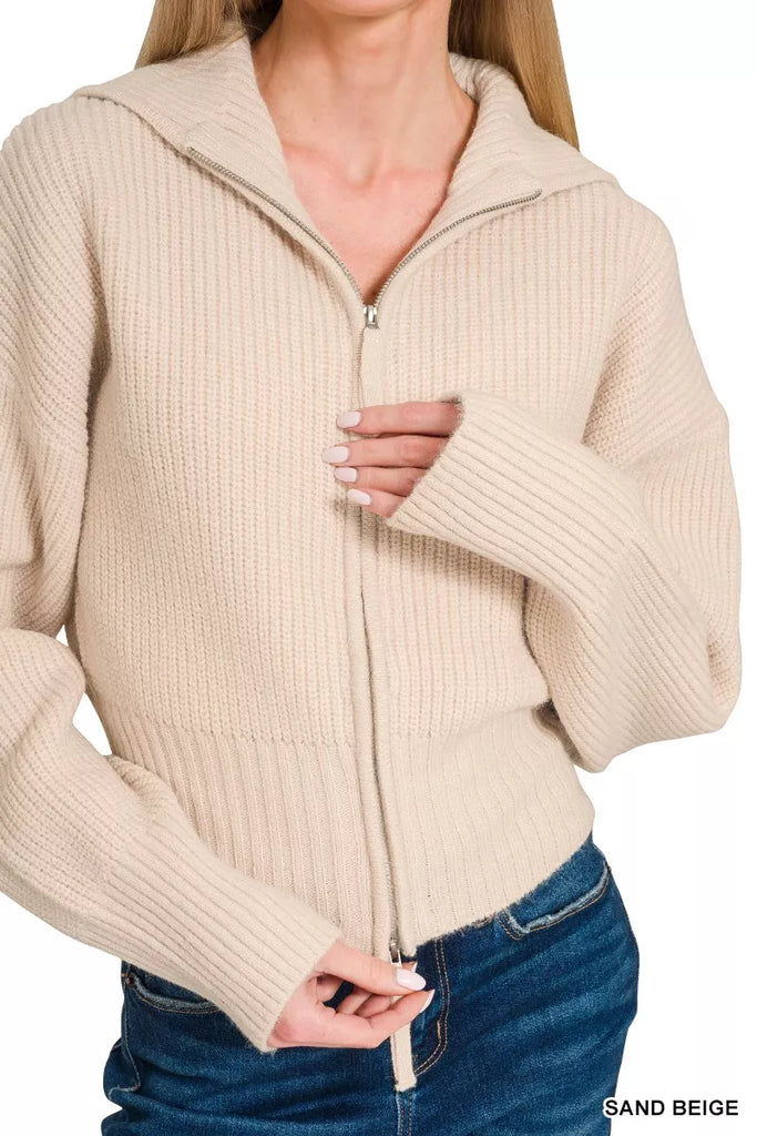 Zenana Ribbed Collared Zip Up Sweater Cardigan