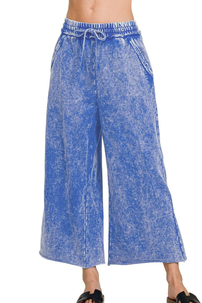 These Washed French Terry Palazzo pants with pockets are both stylish and comfortable. The washed French terry fabric gives them a soft and lived-in look. The palazzo style offers a breezy and relaxed fit, perfect for casual outings or lounging at home. The addition of pockets adds functionality and convenience to these versatile pants.