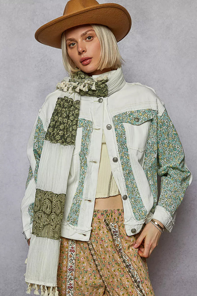 POL Button Down Patchwork Denim Jacket with Floral Print Details