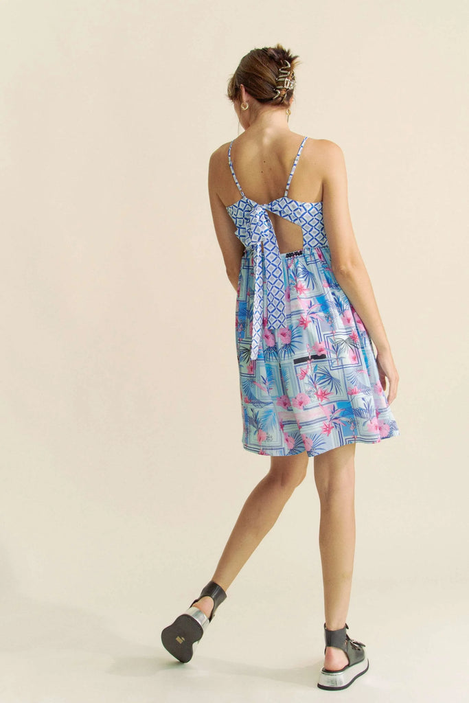 This charming summer romper features a delightful combination of geometric and tropical prints. The bodice showcases a blue and white geometric pattern, while the skirt portion displays a dreamy tropical scene with palm leaves and pink florals against a light blue background. Made from soft, breathable fabric perfect for warm weather, this piece offers both style and comfort. The empire waist design creates a flattering silhouette, while the adjustable spaghetti straps ensure a perfect fit. Ideal for beach vacations, resort wear, or casual summer outings.