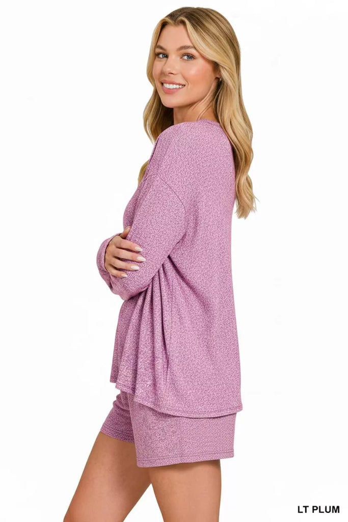 Zenana Soft Melange Long Sleeve Tee and Shorts Set