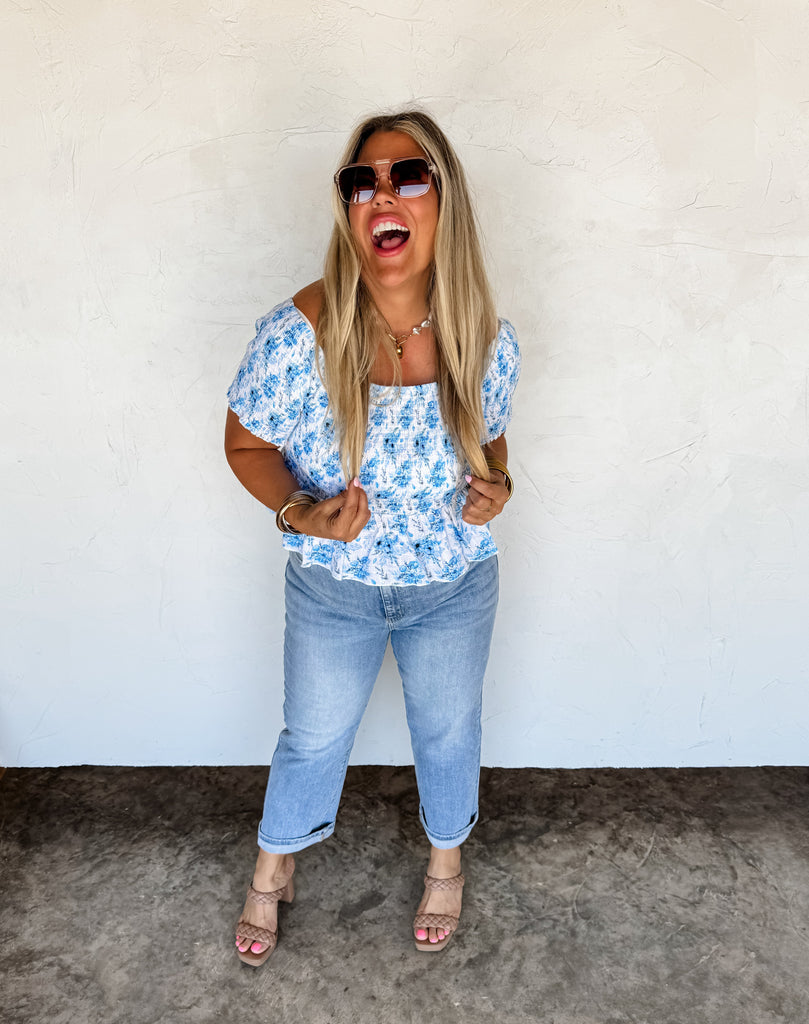 Adorable Spring/Summer top! Has a ruffle hem and a smocked stretchy top that can be worn on or off shoulder. Bra friendly. Color stripe is a muted red. So cute and perfect with shorts or jeans!