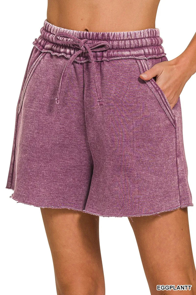 Zenana Acid Wash Fleece Drawstring Shorts With Pockets