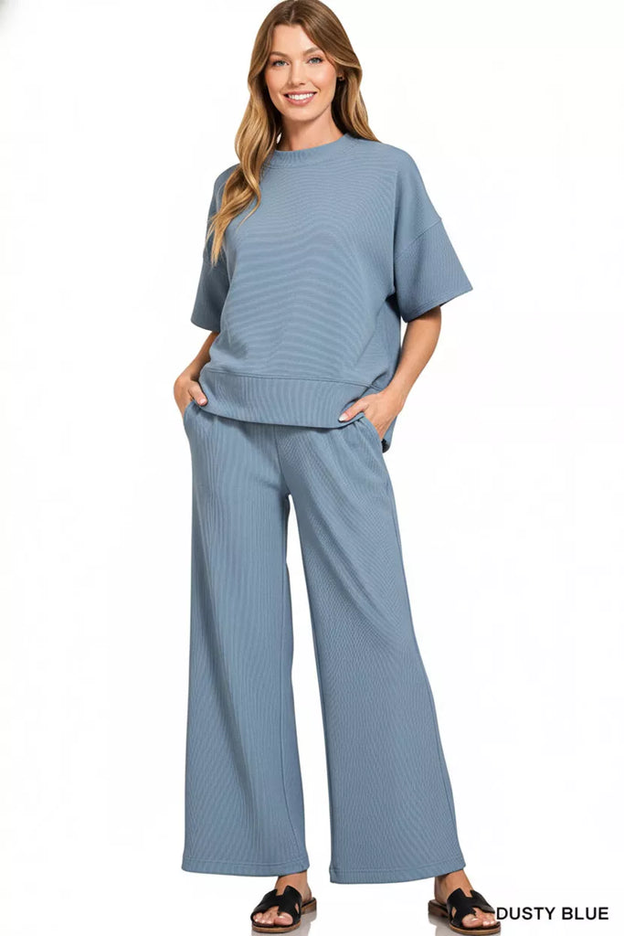 The Ribbed Round Neck Tee & Pants Set is a stylish and coordinated outfit that offers both comfort and style. The ribbed texture adds a unique and textured look to the classic round neck tee, while the matching pants create a cohesive and put-together ensemble. Perfect for lounging at home or running errands, this set combines fashion and functionality seamlessly. The round neck tee provides a casual and versatile top option, while the pants offer a relaxed and comfortable bottom choice. Effortlessly chic and easy to wear, this set is a must-have addition to your everyday wardrobe for a laid-back yet polished look.