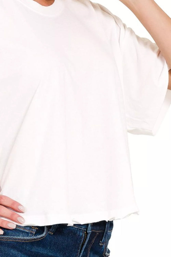 This stylish white T-shirt features distinctive ruffled sleeves that add a feminine touch to casual wear. Made from soft, comfortable fabric with excellent breathability and durability. The relaxed fit design ensures all-day comfort while the elegant ruffled sleeve details create a fashionable statement. Perfect for pairing with jeans, skirts, or shorts for versatile styling options. The classic white color makes it a wardrobe essential that complements any outfit. Ideal for casual outings, work, or weekend activities.