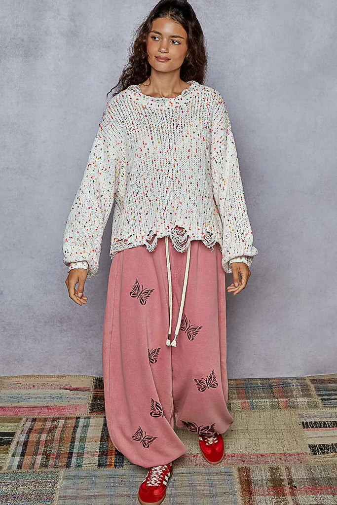 This round neck sweater is designed with long sleeves and a regular fit for a comfortable and stylish look. The popcorn texture features hints of various colors throughout, adding a fun and unique touch. The distressed and fringed hem detailing adds a trendy and edgy vibe to this sweater. Stay cozy and on-trend with this eye-catching sweater featuring a mix of colors and stylish distressing.