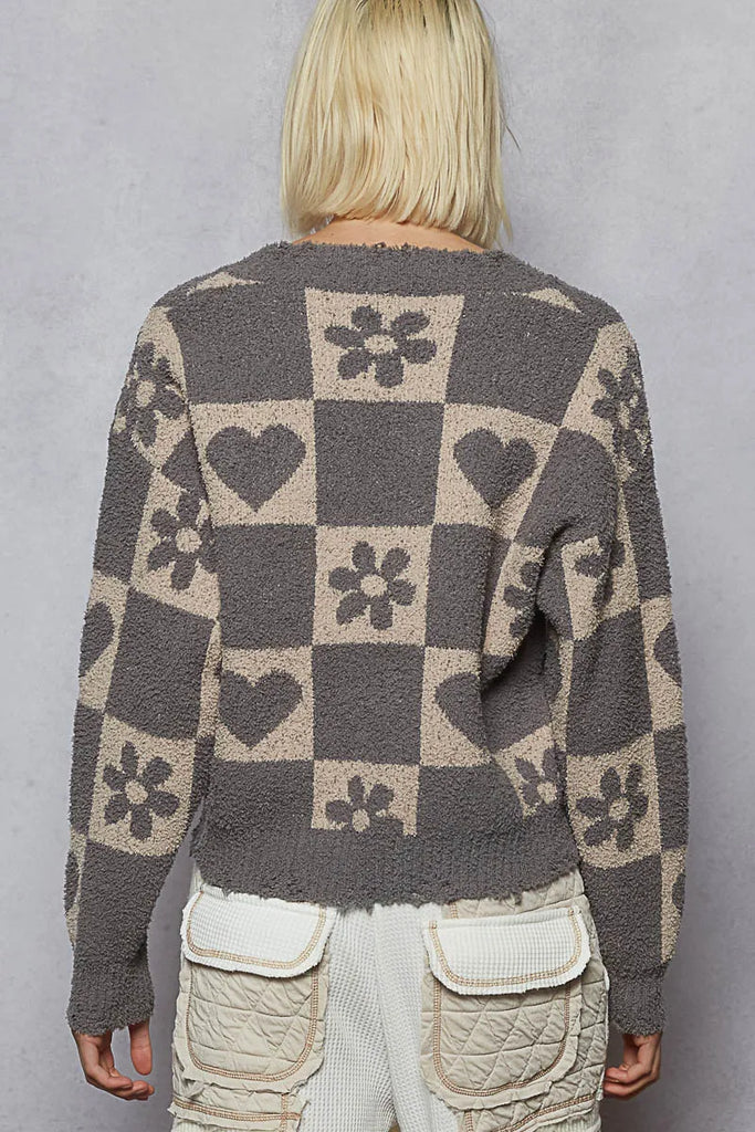 POL V-Neck Heart Pattern Checkered Sweater