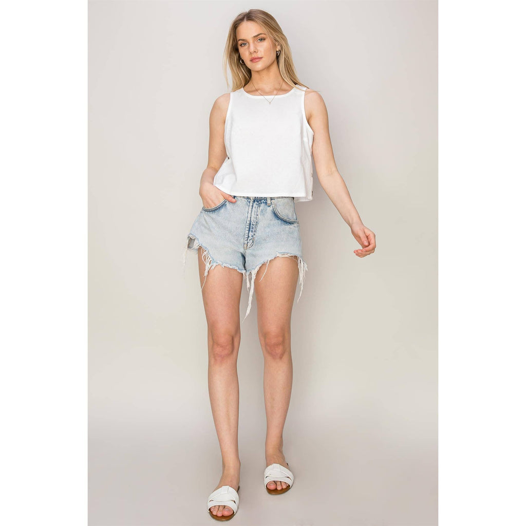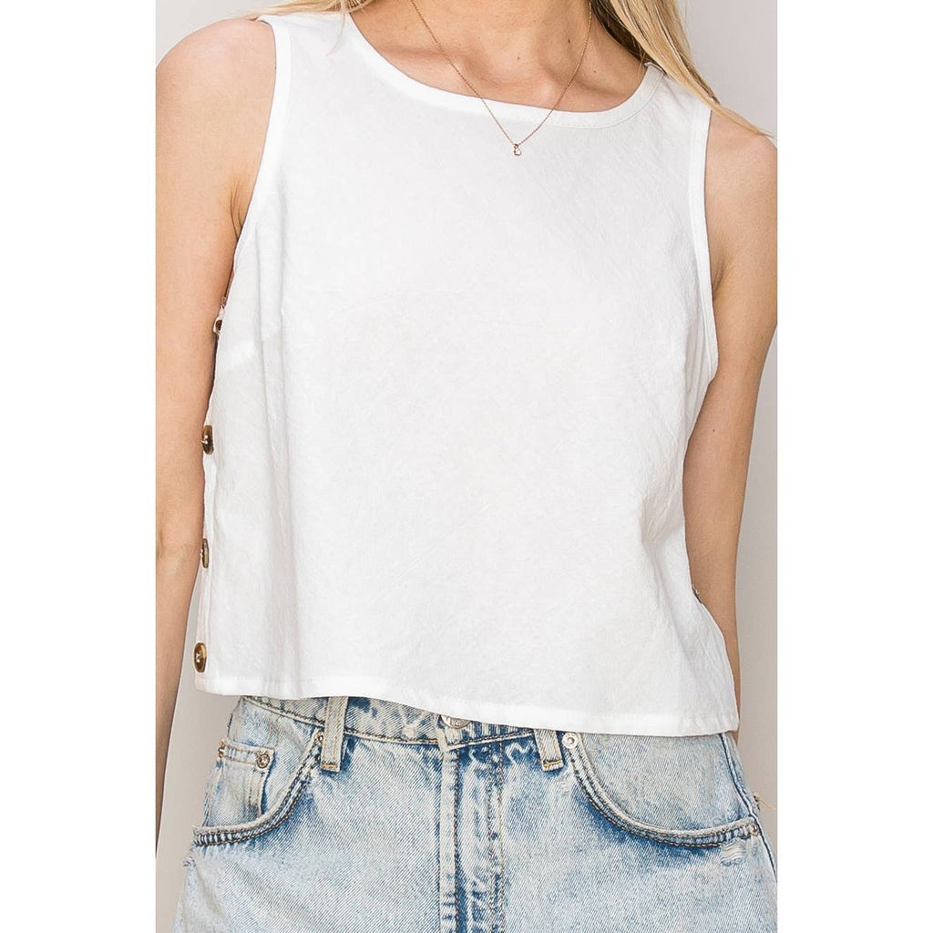 The side-button sleeveless top allows for easy and comfortable wear while still looking stylish. Its unique design features side buttons for added detail and can be paired with any bottom for a versatile and effortless look. Stay fashionable and comfortable with this must-have piece.