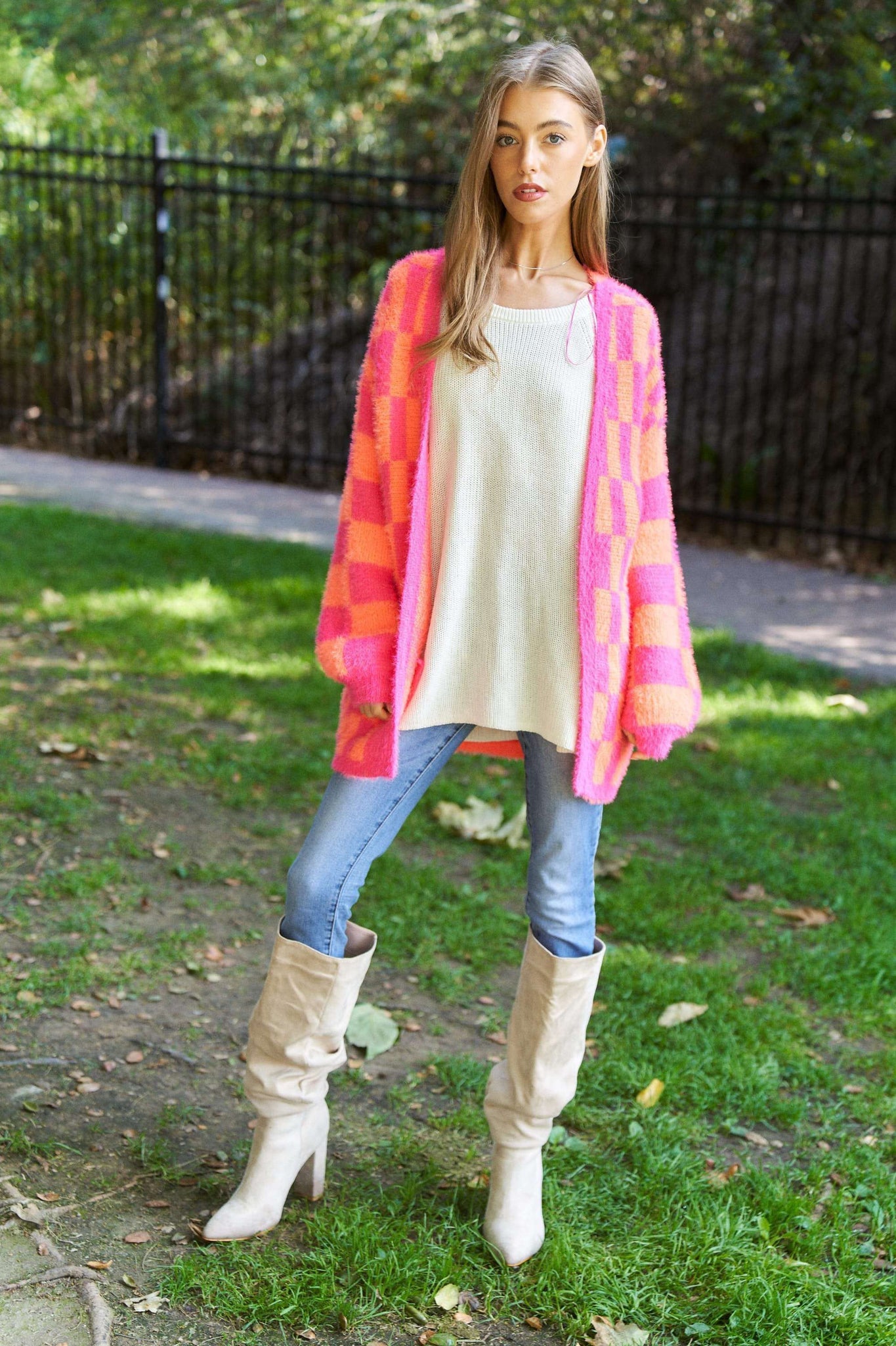 This CHECKERBOARD LONG SLEEVE LOOSE FIT KNIT CARDIGAN is the perfect piece to keep you looking stylish and feeling comfortable. Crafted from a luxurious blend of quality material, this cardigan has a classic checkerboard pattern, long sleeves, and a loose fit that allows for easy movement. Layer this versatile piece over any ensemble and you won't be disappointed.
