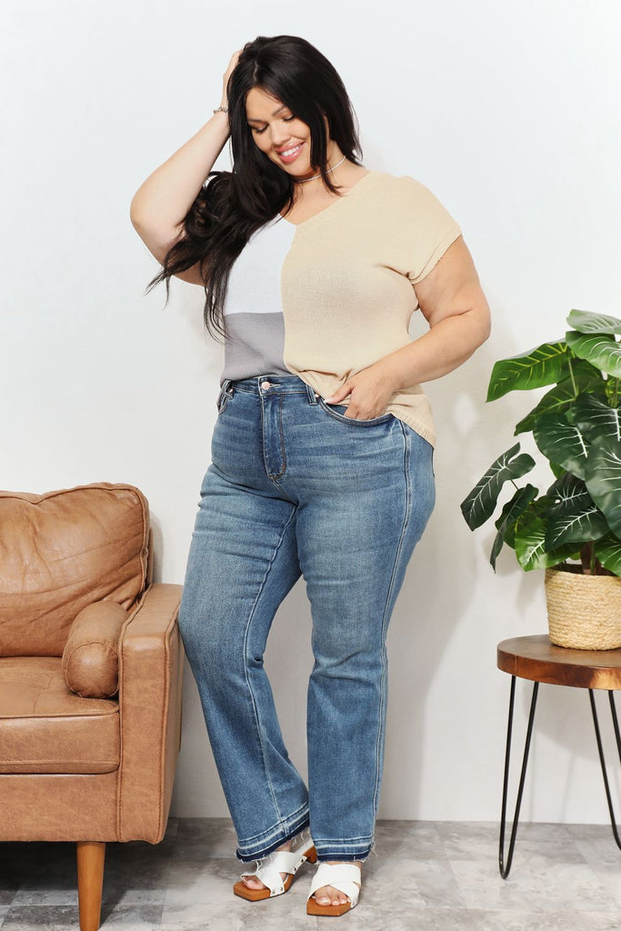 This color block knit top features a V-neckline, adding a touch of sophistication. The short sleeves offer a comfortable and casual look. The color block design adds a modern and stylish element to the top, making it a versatile and fashionable choice for any occasion.