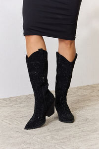 These boots are the epitome of statement footwear, designed to turn heads and steal the show wherever you go. With a knee-high silhouette and an abundance of rhinestone embellishments, they exude a dazzling, unique allure that's perfect for special occasions or elevating your everyday style.