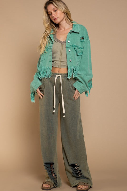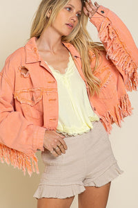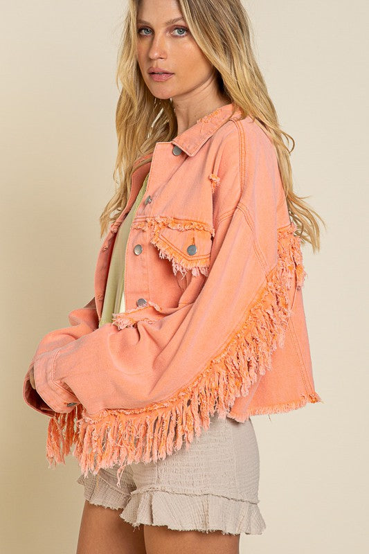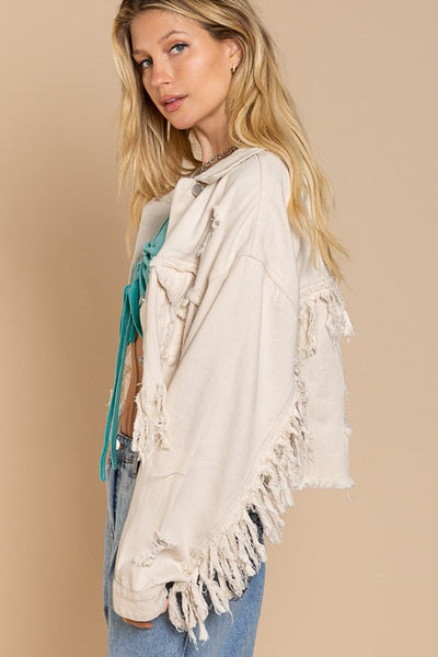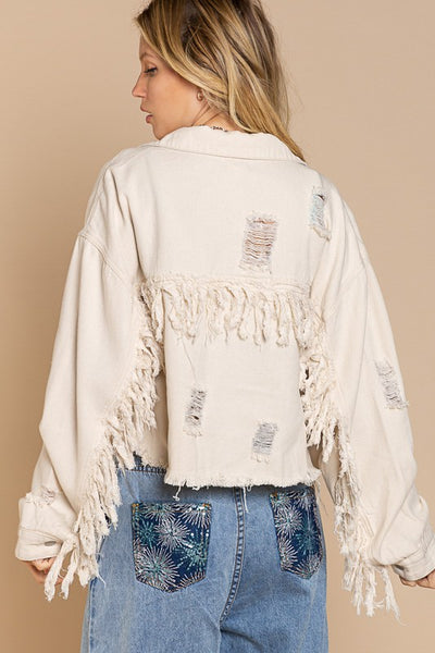 Designed in cropped, slouchy silhouette denim jacket, button closure, fringe detailing throughout on hem, distressed pocket flip detail, distressed seaming detailing on yoke