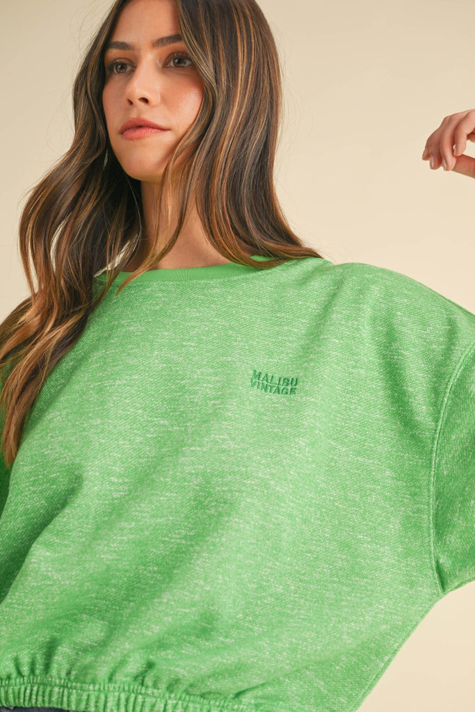 This stylish sweatshirt features a round neck and long sleeves, with a cropped length for a modern touch. The standout detail is the "MALIBU VINTAGE" embroidery lettering on the front, adding a trendy and unique element to the design. The round neck offers a classic and versatile neckline that pairs well with a variety of bottoms. The pullover style makes it easy to wear and style for a casual yet fashionable look. This crop sweatshirt is a great choice for adding a touch of street style and comfort to your wardrobe. Perfect for layering or wearing on its own, it's a versatile piece for creating cool and casual outfits.