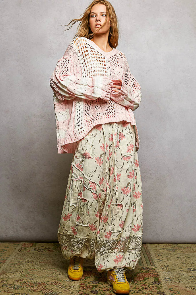 This V-neck long sleeve relaxed fit thin sweater top is crafted from airy cotton with a unique twisted weave for added texture and interest. The color blocked stripe pattern creates a modern and dynamic look, perfect for stylish layering. The see-through weave adds a touch of allure while maintaining a lightweight feel. With a back patch point and rib band detail, this sweater top offers subtle design elements for a polished finish. Elevate your wardrobe with this chic and versatile sweater top that effortlessly combines trendy details with comfort and style.