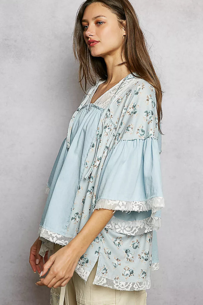 POL Double Gauze Floral Patch Blouse with Lace Detail