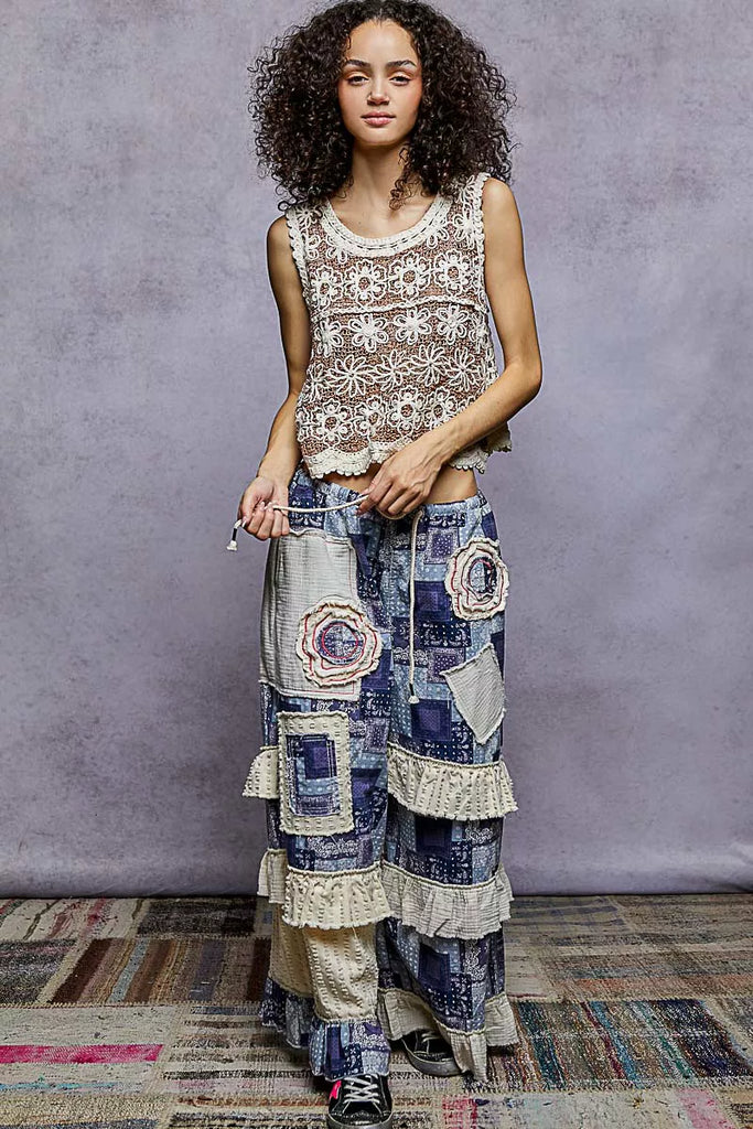 This sleeveless relaxed-fit top offers a breezy and effortless style with its round neckline and delicate crochet construction. The contrasting floral patterns and border accents add a charming and eye-catching detail to the design. Finished with a scalloped edge, this top exudes a subtle and feminine touch that enhances its overall appeal. Perfect for warm weather days or layered looks, this top is versatile and stylish for various occasions. Elevate your outfit with this elegant piece that combines intricate crochet work and lovely floral details.