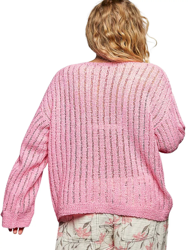Designed in round neck long sleeve relaxed fit open weave sweater top in acrylic. Features a lightweight open-weave construction that offers breathability while maintaining a cozy feel. The relaxed fit creates an effortless drape, perfect for layering over tanks or bralettes. Finished with a soft acrylic texture that provides comfort and easy care, making it a versatile piece for everyday styling.