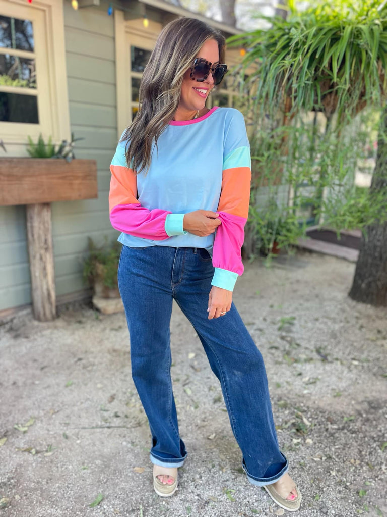 This bright and colorful top is soft, stretchy and a must-have for your fall wardrobe! With a relaxed fit and color block detailing, it's available in five beautiful color combinations. The perfect blend of comfort and style - and at this price you can definitely afford to grab more than one!