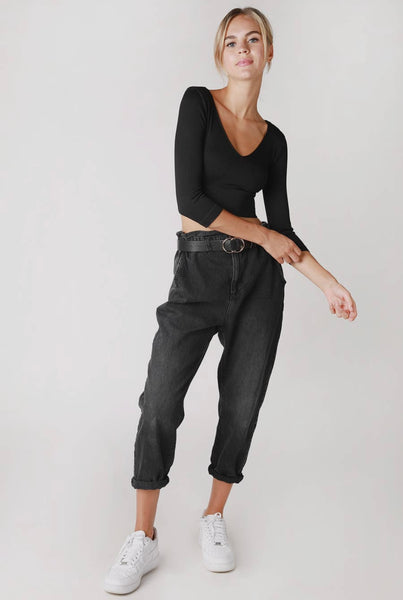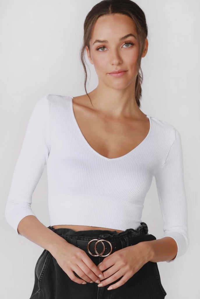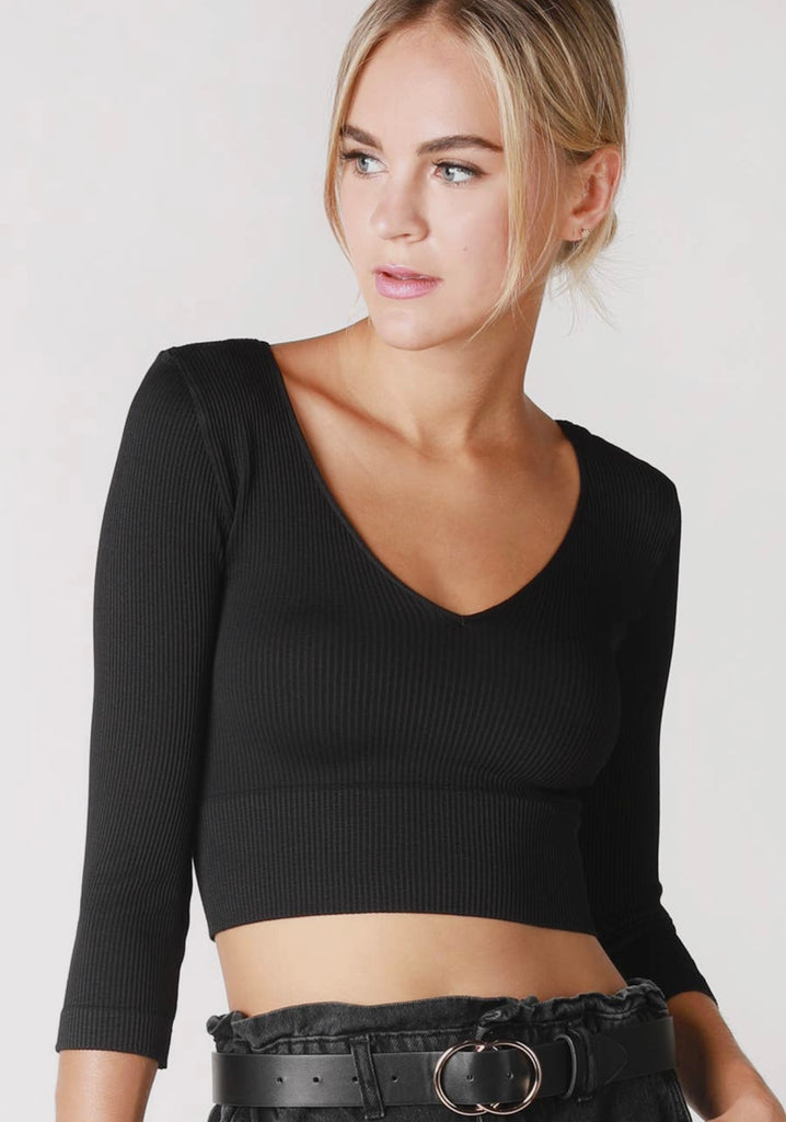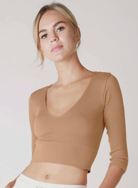 Ribbed 3/4 Sleeve V Neck Crop Top