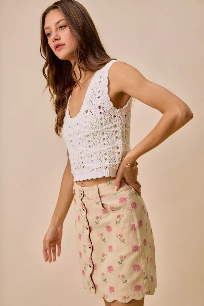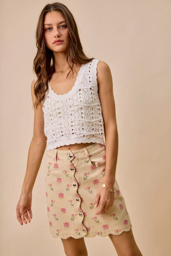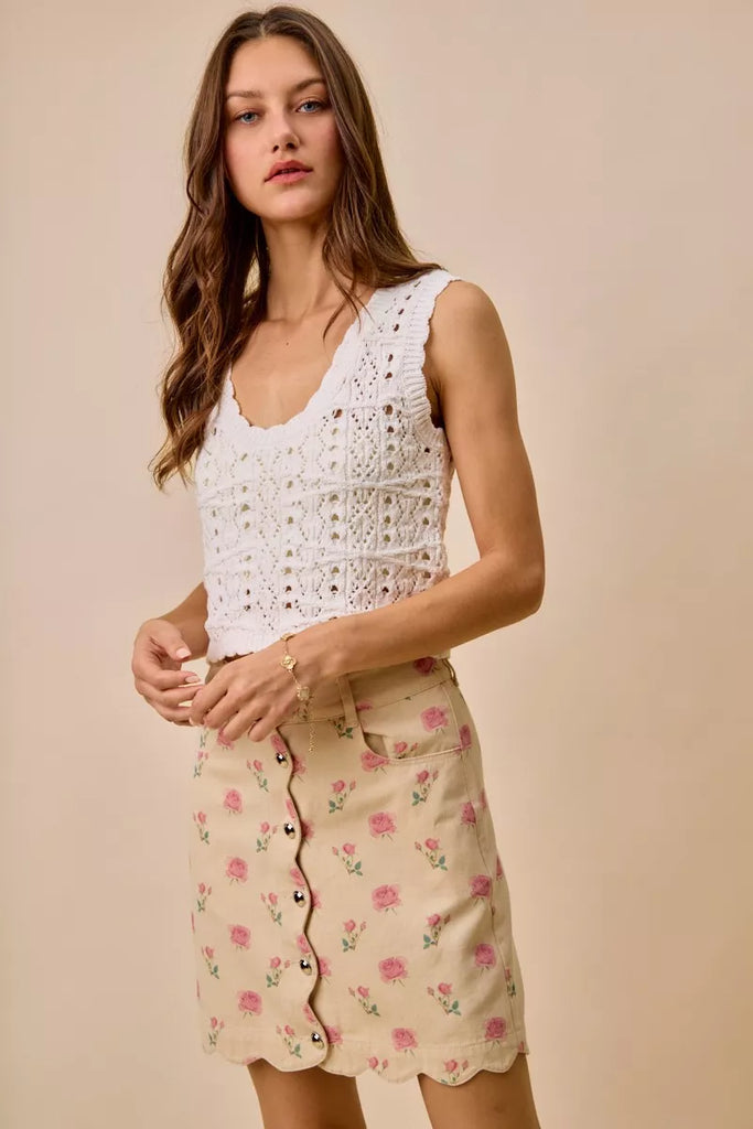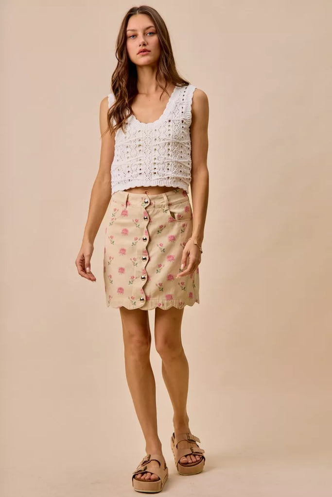 SO ME Floral Rose Print Cotton Twill Scallop Mini Skirt