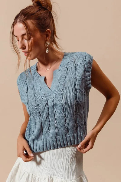 The Notched Neck Cable Knit Sweater Vest is a classic and stylish addition to your wardrobe. Featuring a cable knit design and a notched neckline, this sweater vest offers a timeless and sophisticated look. Perfect for layering over shirts or blouses, it adds warmth and texture to your outfit. Pair it with jeans or trousers for a polished and put-together ensemble.