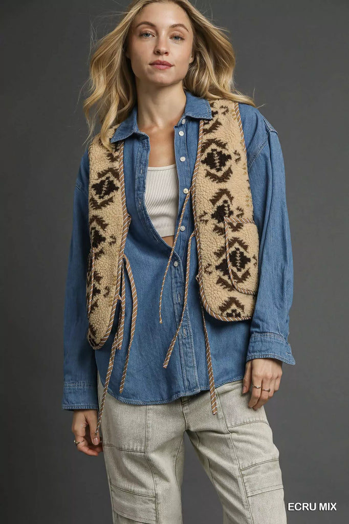 Umgee Mix Patterned Sherpa Tie-Front Vest