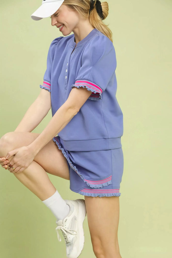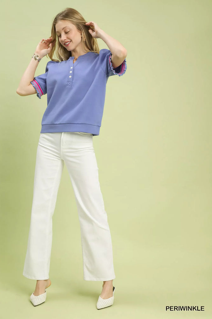Umgee Puff Sleeve Button Front Top with Contrast Trim