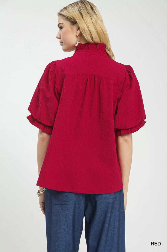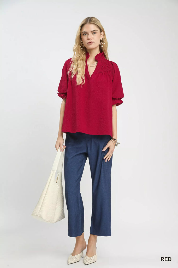 Umgee Textured Smocked Yoke Split-Neck Top