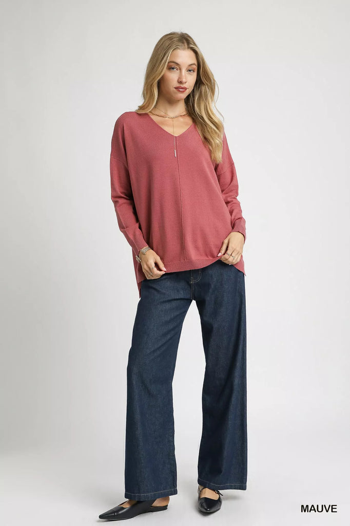 Umgee V-Neck High Low Hem Knit Top with Side Slit
