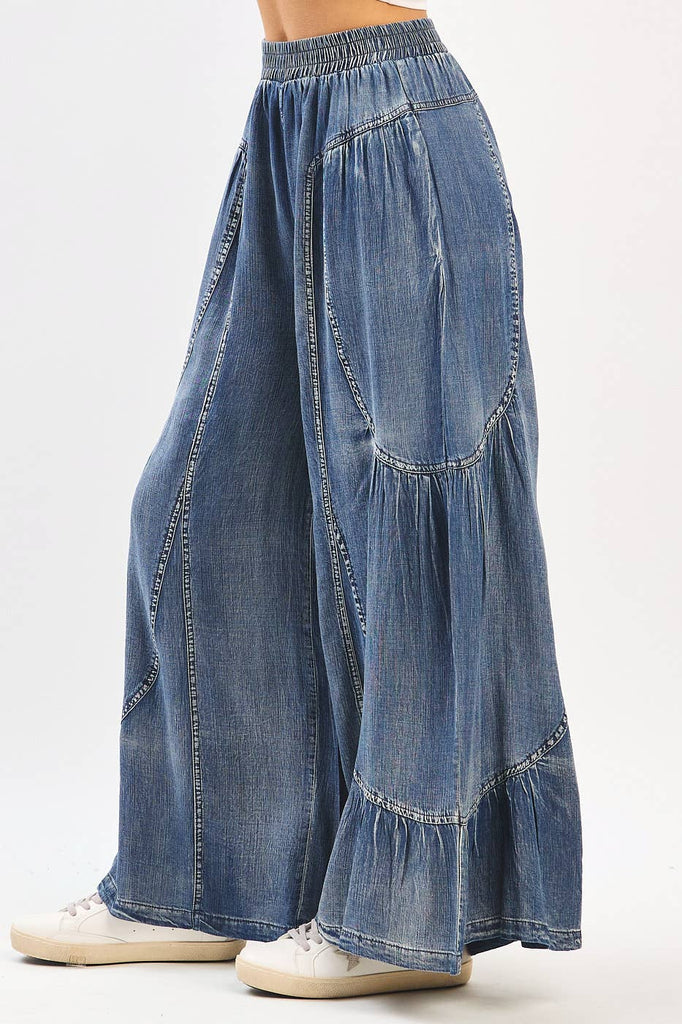 WASHED CHAMBRAY TIER DETAIL WIDE LEG PANTS