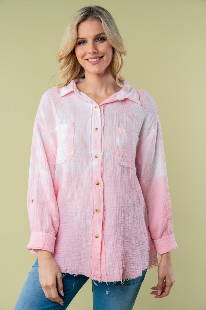 Add a pop of color to your wardrobe with this long sleeve tie-dye Shirt. This shirt features a collared button-down front, button tab sleeves, and a loose fit for a stylish yet comfortable look. Made from lightweight woven material, this shirt is perfect for adding a playful touch to your outfit. Whether you're dressing it up for a night out or keeping it casual for a day of errands, this versatile piece is sure to become a favorite in your closet. Stay on-trend and make a statement with the vibrant tie-dye pattern of this stylish woven shirt.