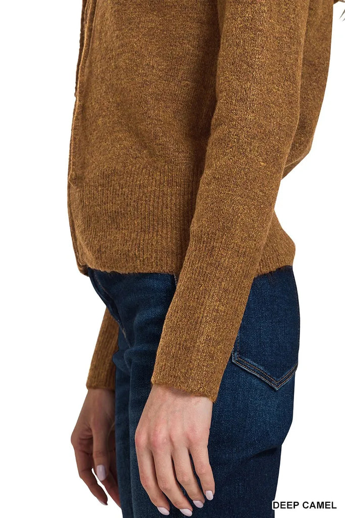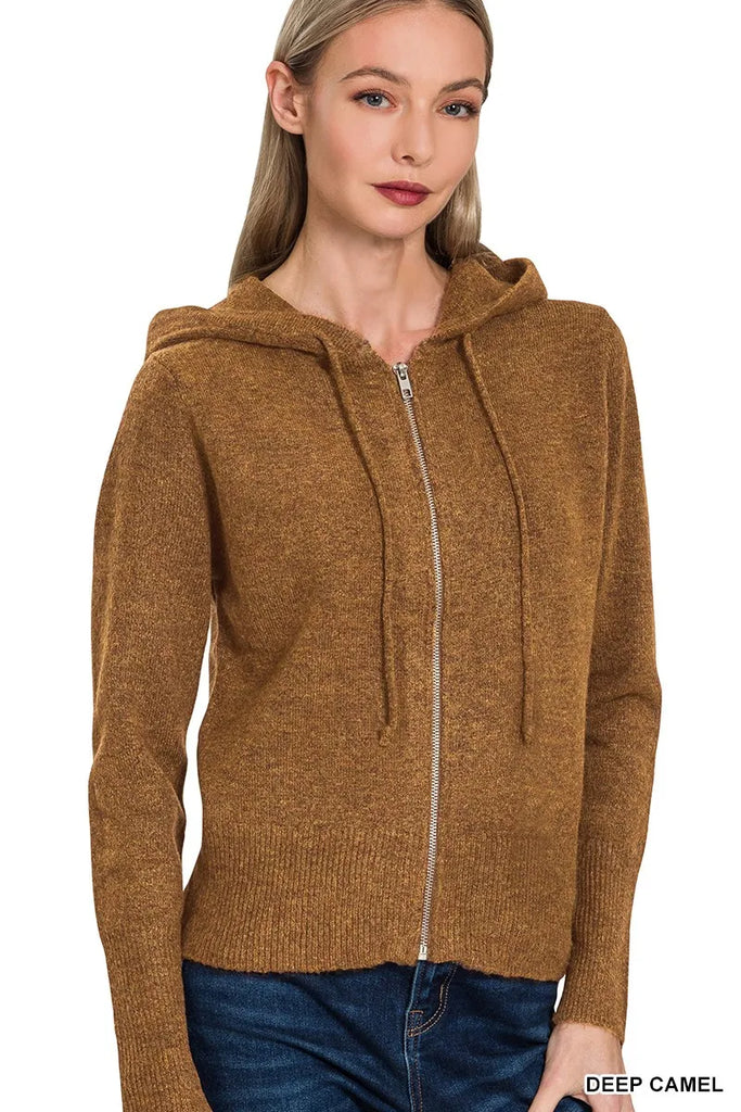 This premium hooded zip-up cardigan features a luxuriously soft knit construction in a rich camel tone. Made from high-quality yarn blend materials, it offers exceptional comfort and durability. The full-zip front closure provides versatile styling options, while the adjustable drawstring hood adds both functionality and modern appeal. Ribbed detailing at the cuffs and hem ensures a perfect fit and polished finish. This classic cardigan silhouette is perfect for layering over tops and dresses, making it an essential wardrobe piece for transitional seasons. The relaxed fit design offers comfortable wear while maintaining an elegant appearance suitable for both casual and semi-formal occasions.