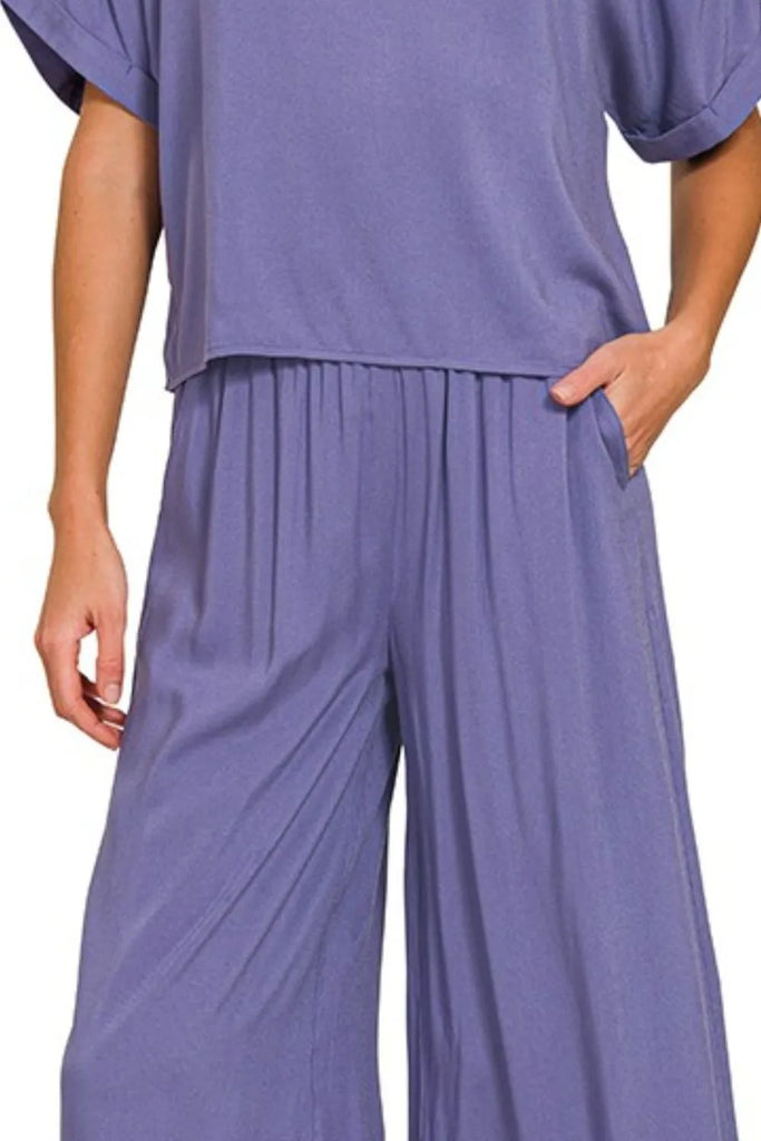 Zenana Round Neck T-Shirt and Wide Leg Pants Set